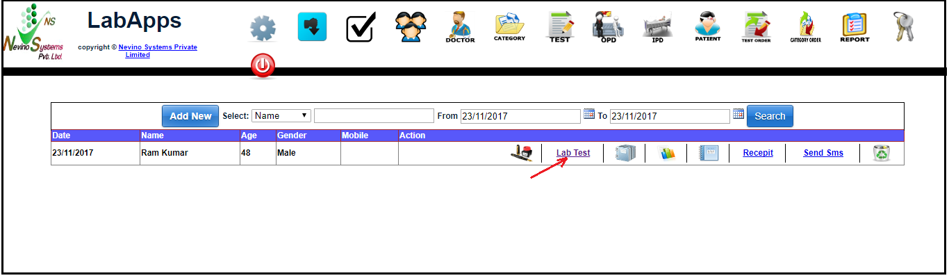 Step 2. A new window will appear as below. As we want to add test results for patient ‘Ram Kumar’ so we will click on ‘Lab Test’ as indicated in image below.