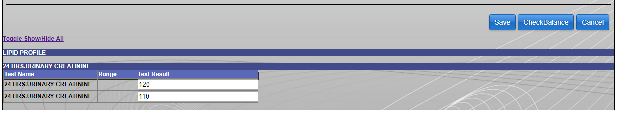 Step 4. For example we want to add test results for ‘LIPID PROFILE’ and ’24 HRS. URINARY CREATININE’. First we will add result for ‘LIPID PROFILE’ so click on it then its window will expand and will look like as shown below.