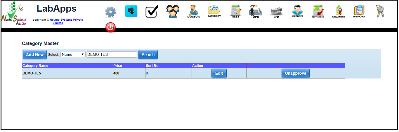 Step 10. On the click of search button the name of new test category will be displayed as shown in below image.