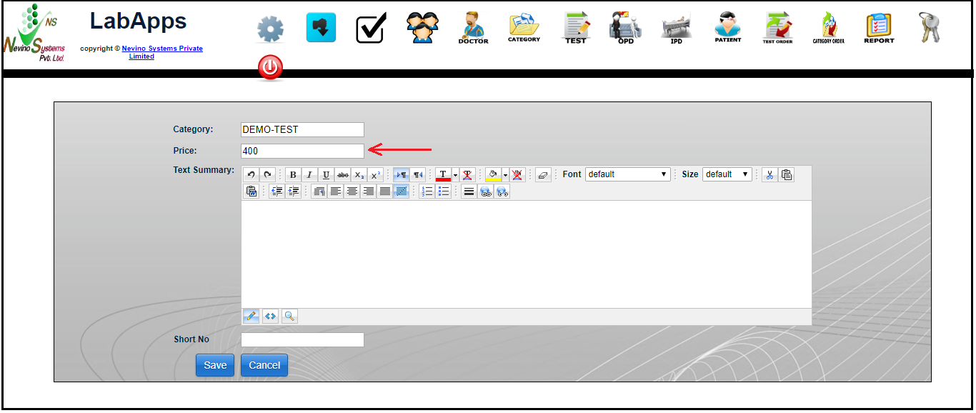 Step 5. Next we will add the price of test so for example we will add price as ‘400’ as per below image.