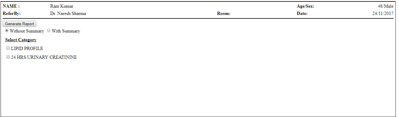Step 6. First we will see ‘Lipid Profile’ report without summary so select the test name and ‘Without Summary’ as below and click on ‘Generate Report’.