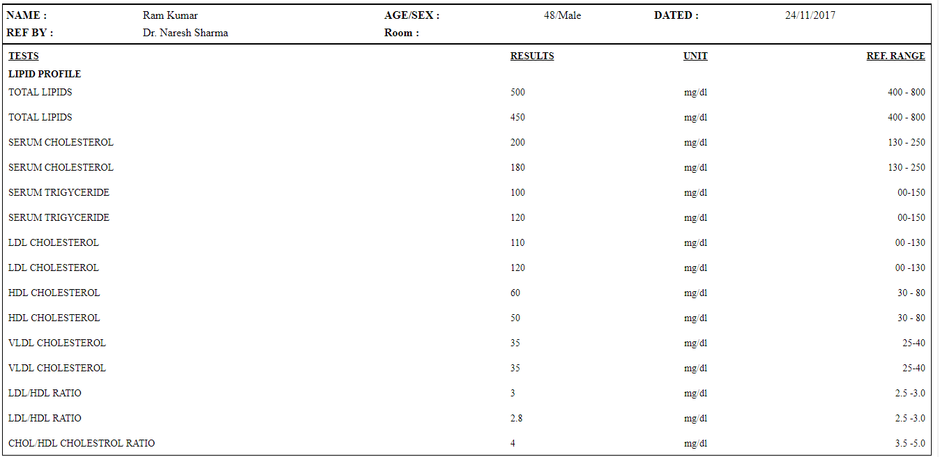 Step 9. The report for ‘Lipid Profile’ with summary will be of two pages as below.