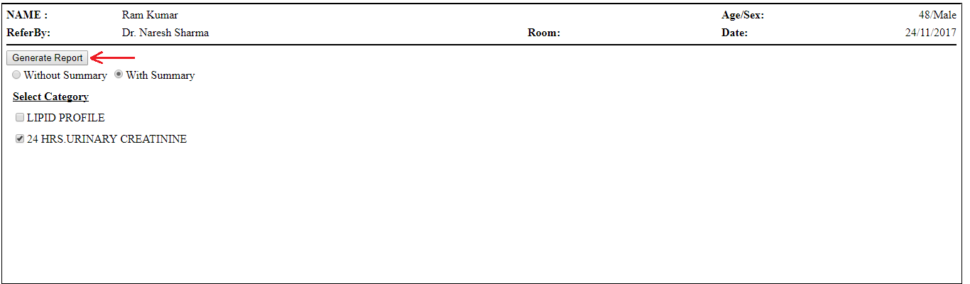 Step 12. Now we will see the report with summary for ‘Urinary Creatinine’ by selecting its name, ‘With Summary’ and click on ‘Generate Report’ as shown in below image.