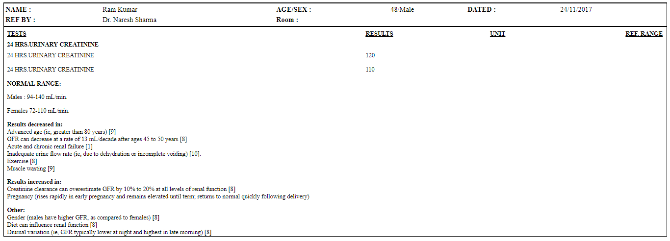 Step 11. The report for ‘Urinary Creatinine’ without summary will look as shown in below image.