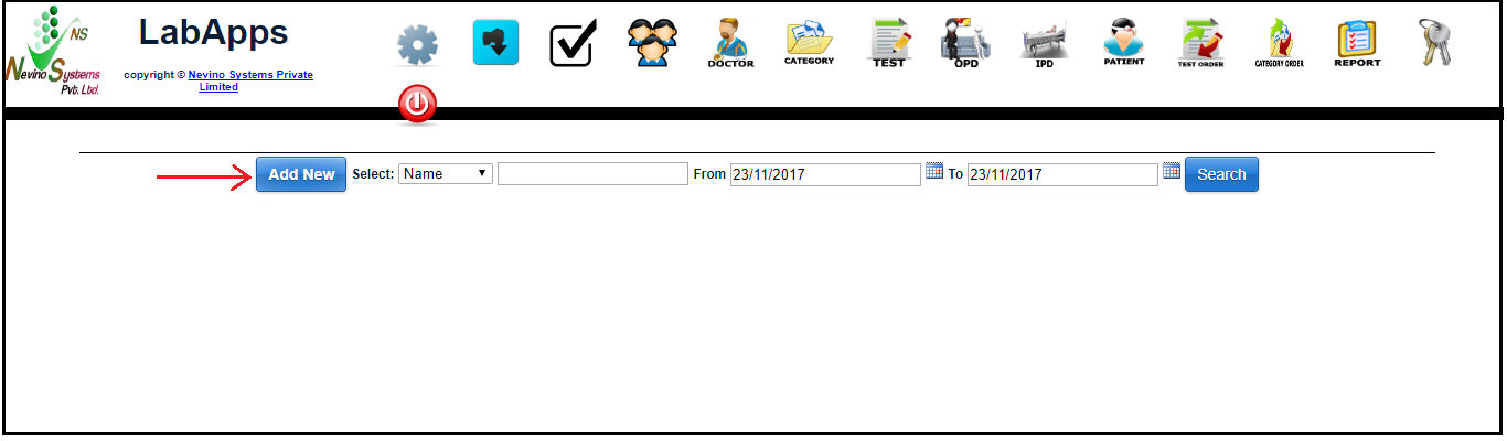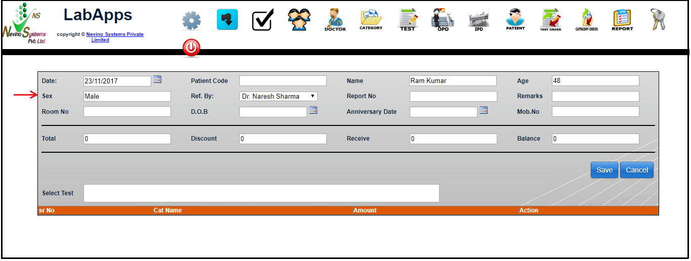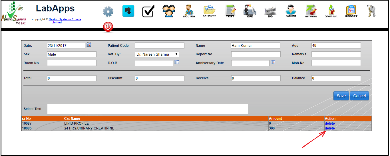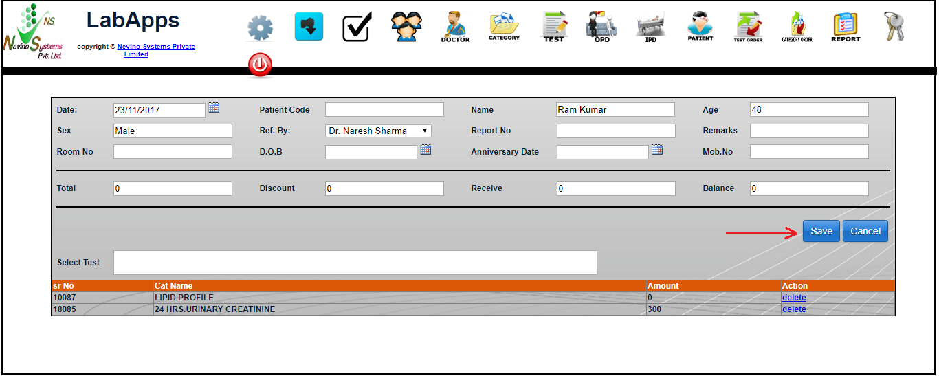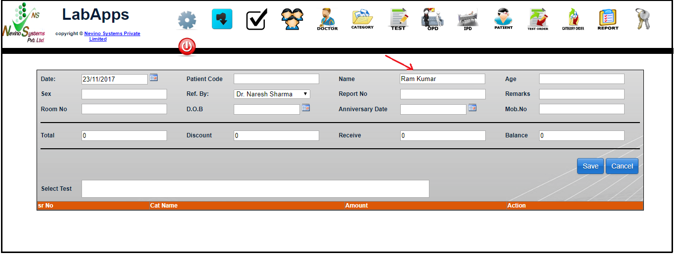 Step 2. A new window will appear as below. As we want to add test results for patient ‘Ram Kumar’ so we will click on ‘Lab Test’ as indicated in image below.