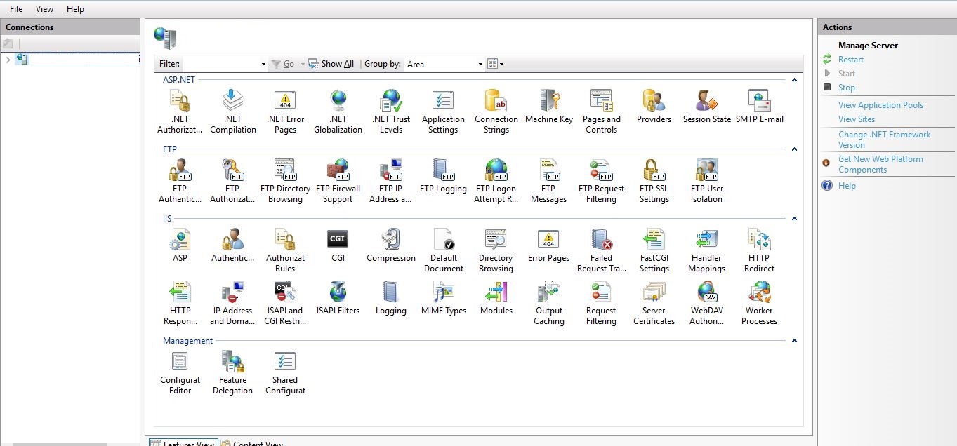 Step 1. Open the IIS(Internet Information Services) Manager by typing ‘IIS’ in search button and press Enter. You will see Internet Information Services Manager window screen as shown below.