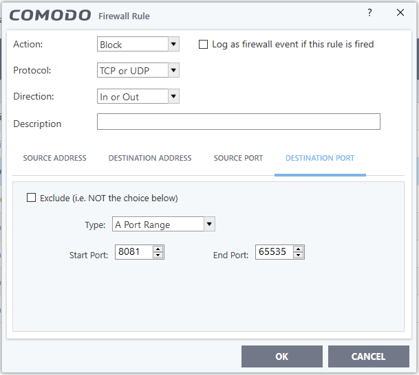 Step 8. Now click the drop down list below where ‘Any’ is displayed and select ‘A Port Range’. Enter the Start Port as ‘0’, End Port as ‘8079’ and click OK. Please refer the image below.